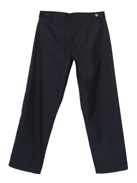A dark navy wool blend gabardine trousers by Comme Des Garçons.